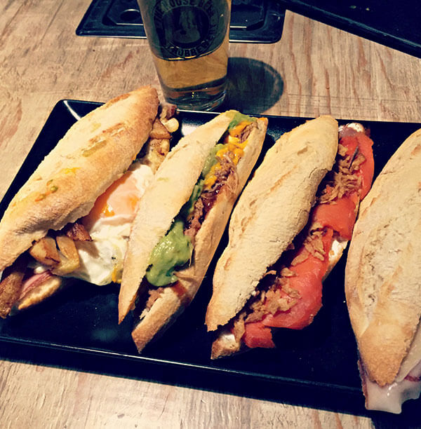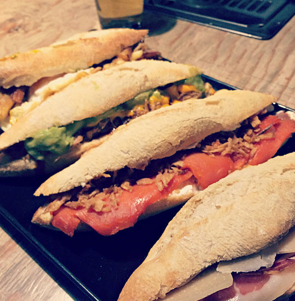 El bocadillo gourmet Horneado al momento, con un delicioso pan artesano y los ingredientes mas naturales... Paleta Ibérica con tomaca y lascas de parmesano, calamares con Ali Oli, bacon con queso brie y calabacín a la plancha, salmón con queso crema y cebolla crujiente, pollo braseado con pimiento verde y virutas de roquefort.
