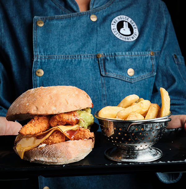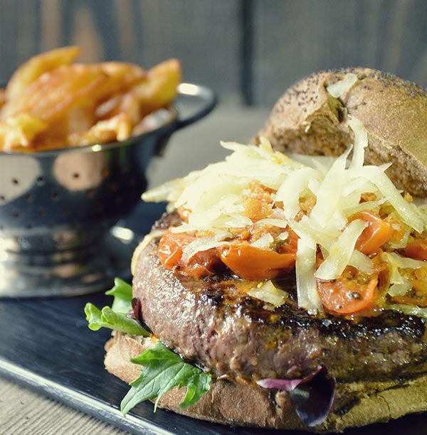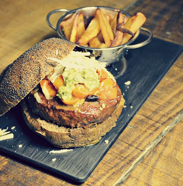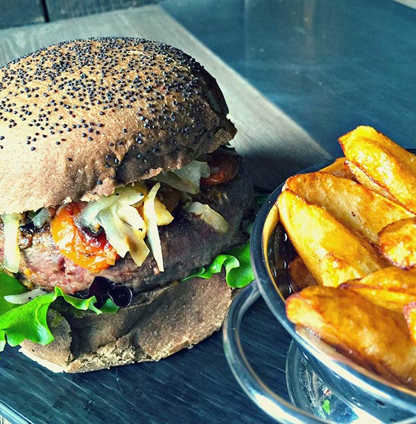 La mejor hamburguesa no esta en una hamburguesería. La mejor carne nacional seleccionada, Maxiburguer o el definitivo TXULEBURGUERTON de buey, con patatas naturales y nuestro exclusivo I’pan, elaborado con malta tostada y lúpulos aromáticos. Si no has probado nuestras hamburguesas, no sabes lo que es bueno... Crema de albahaca, cebolla crujiente y calabacín, huevo, virutas de bacon, gouda fundido, cebolla crujiente, lechuga y tomate.
