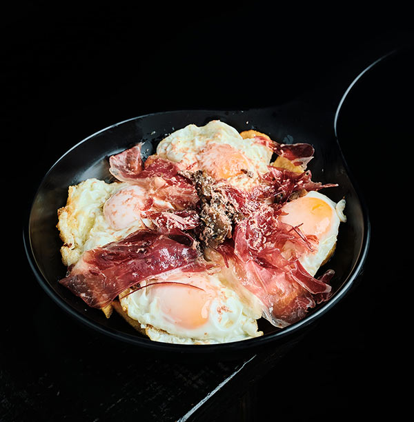 Existen huevos y huevos, los nuestros son de los segundos. De gallinas criadas en libertad, servidos sobre una cama de patata natural... Huevos camperos sobre cama de patata natural con tiras de ibérico, hongos confitados en casa y ralladura de bloc de pato.