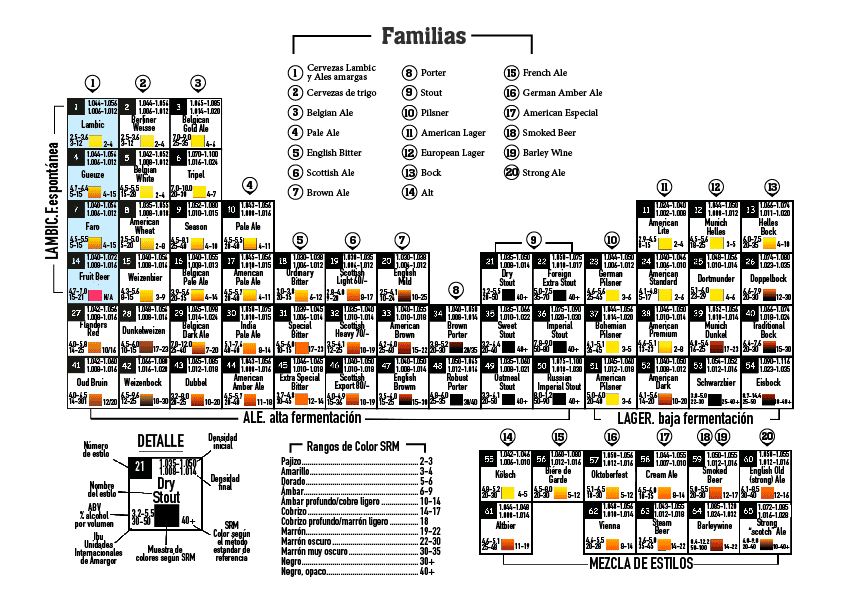 Utilizando el diseño de la tabla periódica de elementos, puedes ver la gran mayoría de estilos de cerveza agrupados por su tipo de fermentación (alta, baja, espontánea y mixta) y familias. En cada estilo podrás ver las nomenclaturas medias el mismo, densidad, alcohol, IBU, etc.